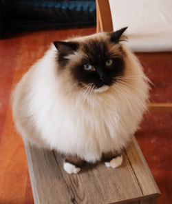 Milo is a 5 year old ragdoll who likes to chase skinks in the garden by day and play feather toy catch at home. His day consists of lots of naps either on the deck table or beside his human’s computer. He loves to greet his human with long monologues in the morning and at all meal times, always making a case of why he should have beef and never tuna. His unique trait is that he has a kink in the last tailbone!